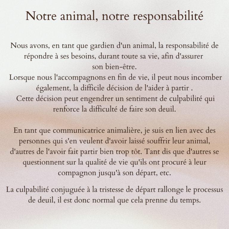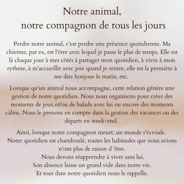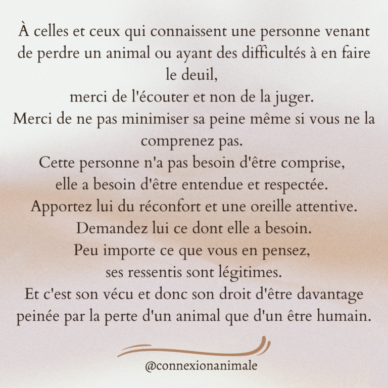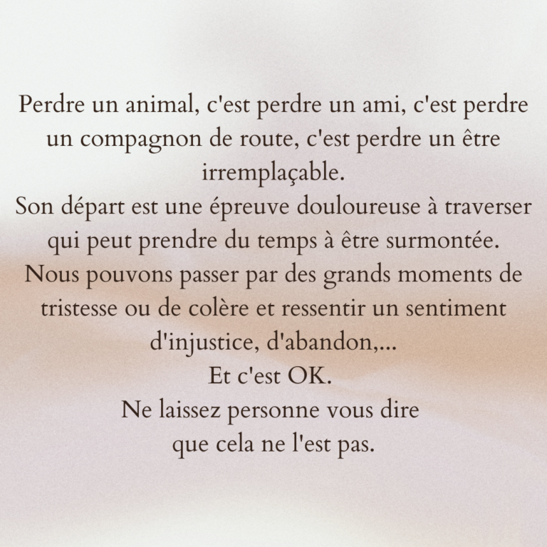 J’ai écris ce post car vous avez été nombreux.ses à me faire part, lors des rdv téléphonique, de votre difficulté à ce que votre tristesse, liée à la perte de votre animal, soit entendue et prise en compte par votre entourage. Nombre d’entre vous se sentent seuls et isolés durant cette période de deuil. L’impact que peut avoir sur nous la perte d’un animal n’est pas suffisamment considéré à l’heure actuelle dans la société et il est temps que cela le soit.