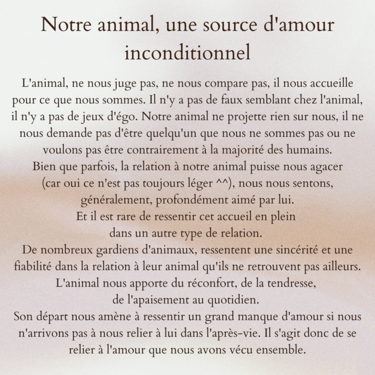Bien que la relation ne soit plus, le lien d’amour que vous avez reste pour l’éternité. Nourrissez-vous de celui-ci et ressentez la présence de votre animal autour de vous. Il n’est jamais loin